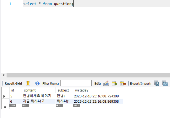 검색결과가 여러 건 일경우는 List<Quesion> 이런식으로 담아야 한다.