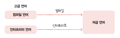 컴파일은 코드 전체가 변환되지만, 인터프리터는 한 줄씩 차례 차례 변환이 된다. 그리고 한 줄씩 저급언어로 변환 될 수 있게 도구 “인터프리터” 를 사용합니다