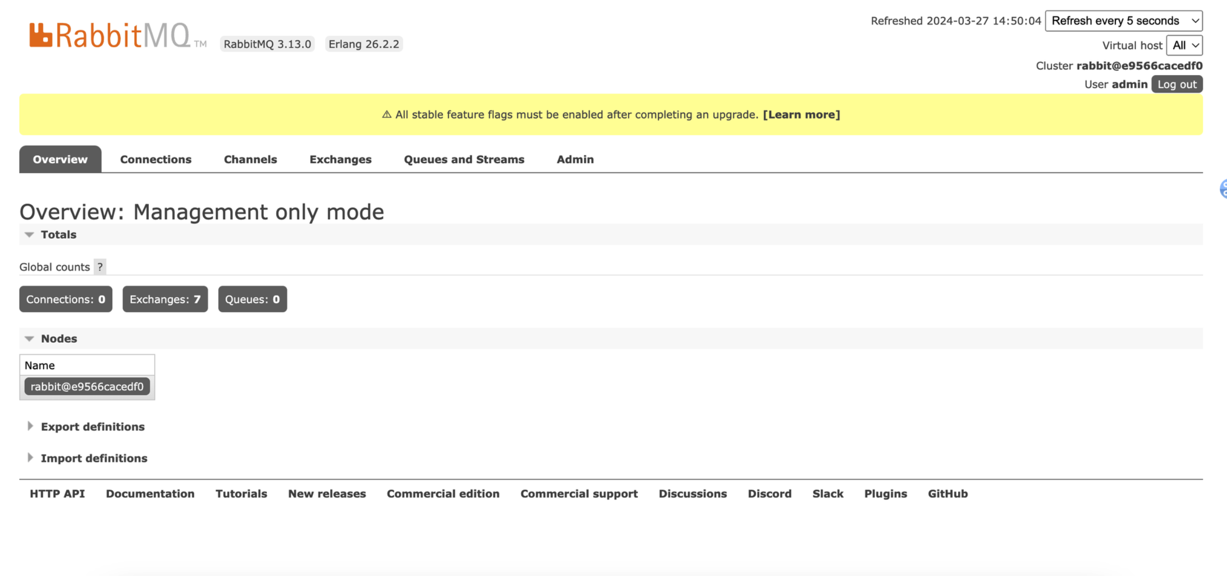 위 화면은 RabbitMq 매니지먼트 대쉬보드 입니다.