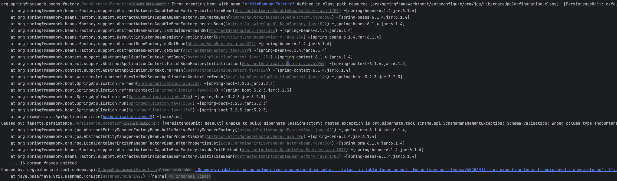 자세히 살펴보니 Entity 설계 할 때 status 컬럼이랑 db 에 있는 status 컬럼이랑 타입이 불일치 한다는 이야기 였습니다.