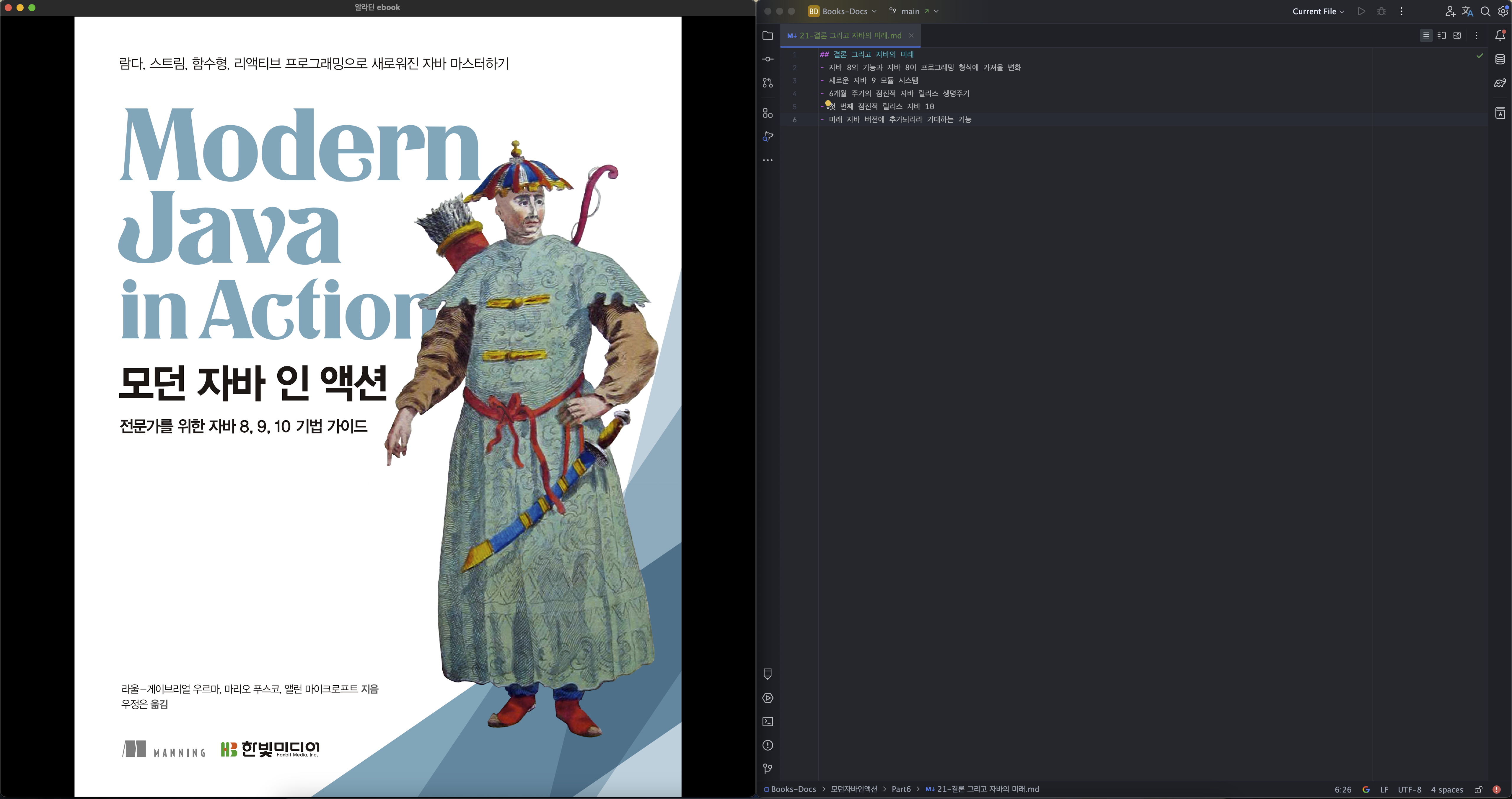 왼쪽에는 ebook, 오른쪽부분에는 인텔리제이 에서 md 파일을 사용해 중요 내용을 필기하며 책을 읽었습니다.
