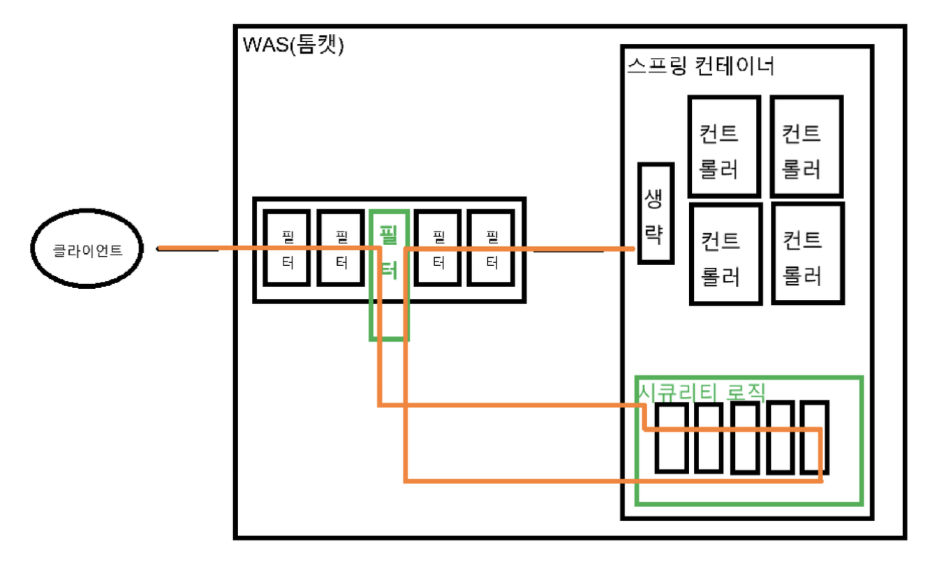 - WAS(=서블릿 컨테이너) 의 필터에 하나의 시큐리티 전용 필터를 만들어서 넣고 해당 필터에서 요청을 가로챔