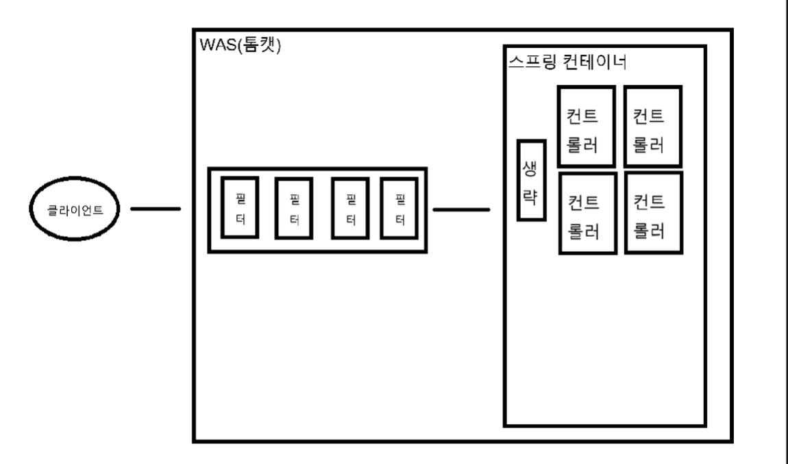 클라이언트에서 Http 요청이 오면 서블릿 컨테이너(=톰캣) 이 요청을 받아 서블릿 컨테이너 필터를 거친 후에